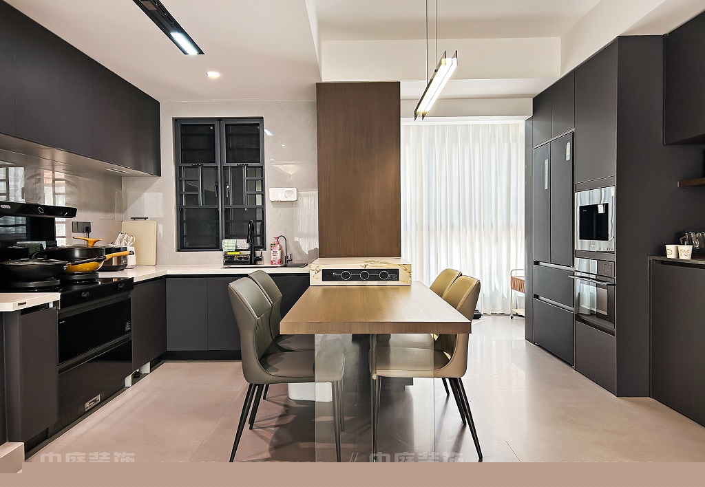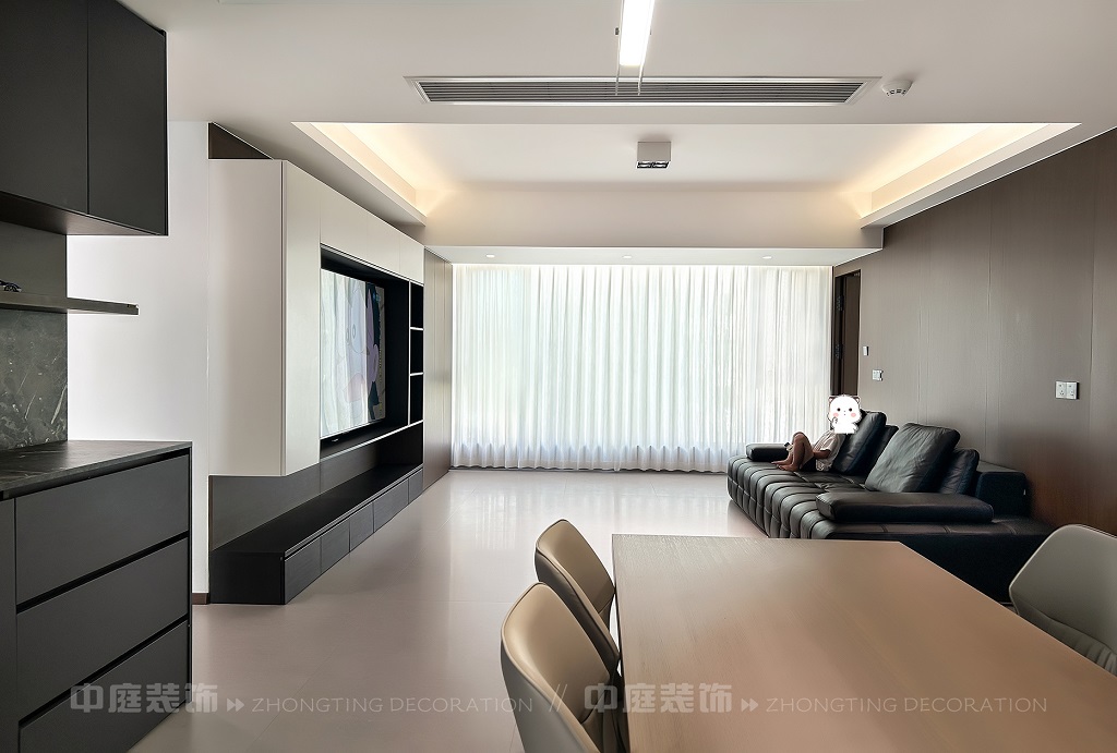 瀏覽量:75客廳以現(xiàn)代黑白灰極簡(jiǎn)風(fēng)格為核心,大面積白紗簾引入自然光線,黑色皮質(zhì)沙發(fā)質(zhì)感高級(jí)。開放式布局,深灰櫥柜與木質(zhì)餐桌形成材質(zhì)對(duì)比,線性吊燈提升精致感,功能與美學(xué)兼具,營(yíng)造現(xiàn)代簡(jiǎn)約的烹飪用餐氛圍。輕柔窗簾與柔和燈光,打造靜謐休息空間。精致的材質(zhì)選擇與合理的功能規(guī)劃,詮釋了“少即是多”的現(xiàn)代簡(jiǎn)約居住美學(xué)。