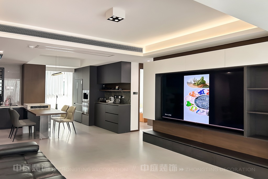 瀏覽量:45客廳以現(xiàn)代黑白灰極簡風(fēng)格為核心,大面積白紗簾引入自然光線,黑色皮質(zhì)沙發(fā)質(zhì)感高級。開放式布局,深灰櫥柜與木質(zhì)餐桌形成材質(zhì)對比,線性吊燈提升精致感,功能與美學(xué)兼具,營造現(xiàn)代簡約的烹飪用餐氛圍。輕柔窗簾與柔和燈光,打造靜謐休息空間。精致的材質(zhì)選擇與合理的功能規(guī)劃,詮釋了“少即是多”的現(xiàn)代簡約居住美學(xué)。